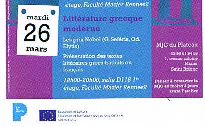 Georgia Karasavvidou, Assistante Grundtvig sous l'égide du Programme Européen de Formation tout au Long de la Vie, animera un atelier de deux heures sur la Littérature grecque moderne. Elle présentera des textes littéraires traduits en français d'écrivains grecs ayant reçu le Prix Nobel(Giorgos Seféris, Odysseas Elytis...).