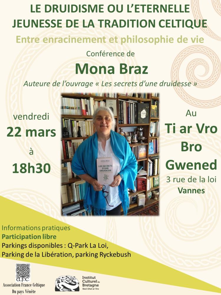 Conférence de Mona Braz Le druidisme ou l'éternelle jeunesse de la tradition celtique Ti ar Vro - Gwened / Vannes Vendredi 22 Mars - 18h30 Co-organisé par l'association France Celtique du Pays Vénète et l'institut culturel de Bretagne - Skol Uhel ar Vro. Participation libre