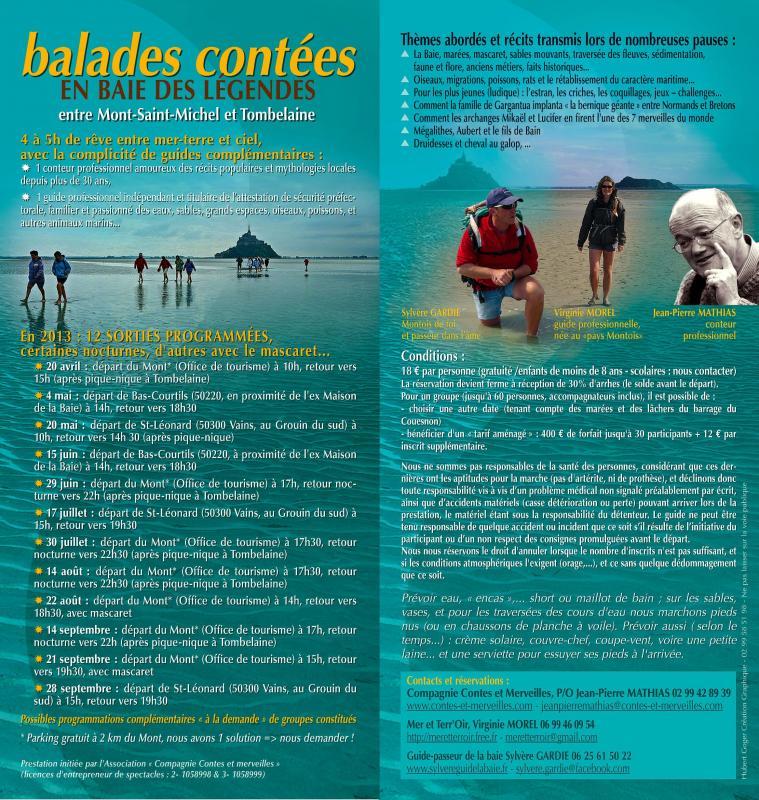 Pas moins de 12 sorties sont ainsi programmées en Baie du Mont Saint-Michel, du printemps (20 avril) à l\'automne (28 septembre), certaines nocturnes, d\'autres en rdv avec le mascaret... Thèmes abordés et récits transmis lors de nombreuses pauses : La Baie, marées, sables mouvants, traversée des fleuves, sédimentation, faune et flore, anciens métiers, faits historiques... Oiseaux, migrations, poissons, \"les rats et le rétablissement du caractère maritime\" !... Comment la famille de Gargantua implanta \"la bernique géante\" entre Normands et Bretons, Comment les archanges Mikaël et Lucifer en firent l\'une des 7 merveilles du monde mégalithes, Aubert et le fils de Bain, druidesses et cheval au galop, ...