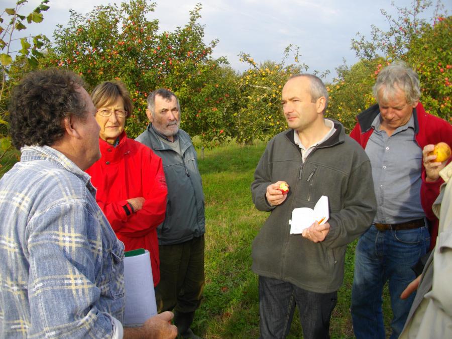 Caractéristiques du verger conservatoire d'Arzano : 22 ans d'âge, 50 ares, 250 pommiers greffés sur des porte-greffe M106, 120 variétés de pommes aux noms savoureux, quatre tonnes récoltées chaque année, pommes à cidre principalement. Et un guide, qui s'y connaît !Jean-Pierre Roullaud de l'association "Arborepom" d'Arzano, fait visiter : il nomme chacune des pommes par son nom, en breton, en gallo ou en français, il fait sourire son auditoire. Nombreuses sont les "Dous" (sucrée), reliées à la religion (la pomme de Judas, de Joachim, de Jérusalem, de Madeleine, du curé...), dues à un certain Bacon (une page entière dans le répertoire Crochetel de pomologie, manuel destiné aux élèves de l'école d'horticulture de Quimperlé en 1905. Certaines variétés sont précoces et n'ont plus aucun fruit, d'autre se conserveront jusqu'en mai. Certaines permettent de faire un cidre tout de suite, d'autres de la compote, certaines sont indispensables à tout vrai cidre digne de ce nom. La "Guillevic", la reine du cidre de Pont-Scorff (cidre transparent qui ressemble à du champagne) ne prend pas dans ce verger. D'autres pommes se plaisent, certains noms font rire, la “kignet fri” par exemple, qui signifie “nez écorché”. Une variété de pomme n'existe que sur un rayon d'un kilomètre à Locunolé, elle n'a pas quitté son village : la "Gwen Penker diffon". Une Américaine s'est plue : "l'Ontario".