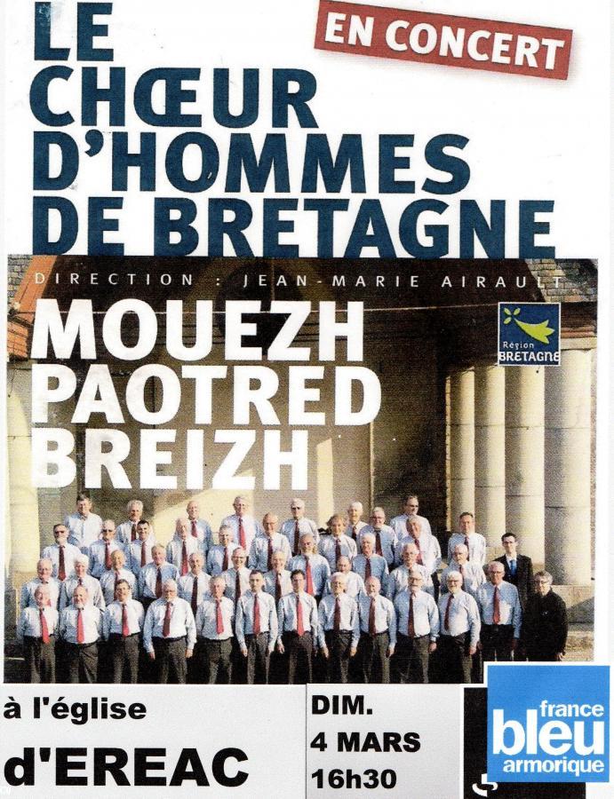 Choeur créé pour représenter la Bretagne à Atlanta (USA) en 1994, il est, depuis, par ses voyages, en France et à l'étranger, un ambassadeur de la culture bretonne. Plus de 400 concerts donnés un peu partout en Bretagne dont le festival de Cornouaille à Quimper et le Festival interceltique de Lorient mais aussi Paris , l'Alsace, le pays Basque, et partout en France. Les tournées à l'étranger les ont fait se produire au pays de Galles, bien sûr, mais aussi en Irlande, en Asturies, Lettonie, Tchéquie, Angleterre, Suisse, Italie, Ecosse... et Pologne bientôt. Les chanteurs viennent des 5 départements historiques de la Bretagne et additionnent les distinctions (prix de la création en 2013 et 4 fois champion de Bretagne 1ère catégorie entre 2008 et 2016). Paradoxalement moins connu en pays Gallo, la venue de "Mouezh Paotred Breizh" à Eréac , petit bourg entre pays de Lamballe et Dinan sera donc une sorte d'événement.