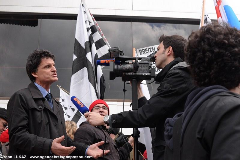- Nantes, 19 avril 2014, manifestation. Personnalités au pied de la tour Bretagne. François de Rugy et Paul Molac écoutent Patrick Mareschal.