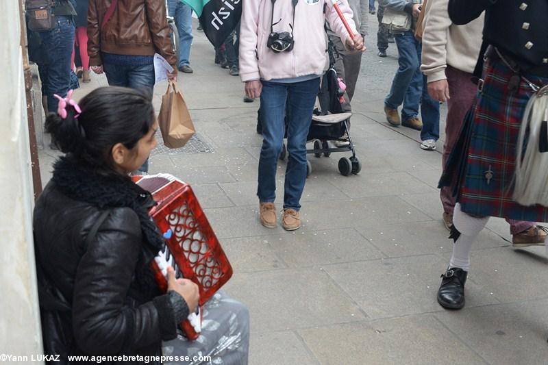 - Nantes, 19 avril 2014, manifestation. Scène de rue: la musicienne et le kilt.