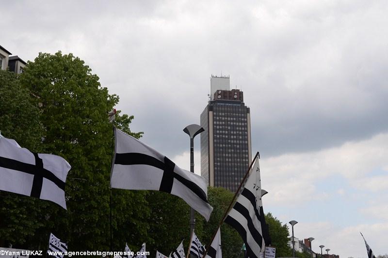 - Nantes, 19 avril 2014, manifestation. "Kroaz zu" et "Gwenn-ha-du". Au fond, la tour Bretagne.