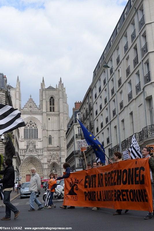 - Nantes, 19 avril 2014, manifestation. Devant la cathédrale Saint-Pierre. Banderole Ai'ta! "Evit ar Brezhoneg / Pour la langue bretonne".