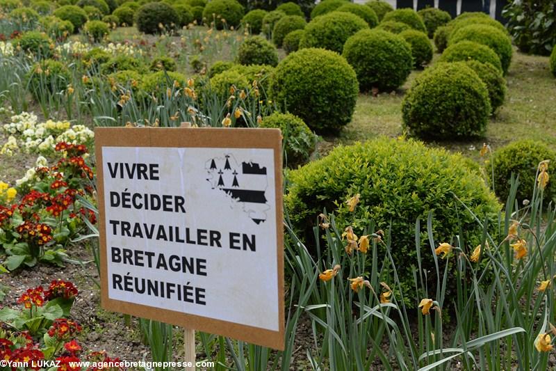 - Nantes, 19 avril 2014, manifestation. Nantes, ville verte. Pancarte "Vivre, décider, travailler en Bretagne réunifiée".