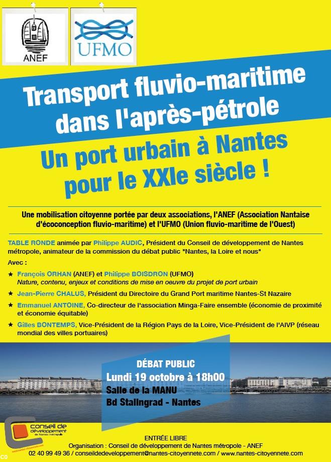 Entrée libre. Organisation : Conseil de développement de Nantes métropole et ANEF. 02 40 99 49 36 Lundi 19 octobre de 18 h à 20 h Salle de la Manufacture, bd Stalingrad, Nantes.Une mobilisation citoyenne portée par deux associations, l'ANEF (Association Nantaise d'Écoconception Fluvio-maritime) et l'UFMO (Union Fluvio-Maritime de l'Ouest).