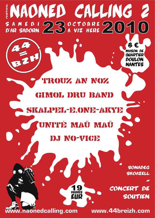 Naoned Calling II, concert militant organisé par 44=Breizh et Reuz er Vro aura lieu le 23 octobre à la Maison de quartier de Doulon, à Nantes, à partir de 19 h.Comme lors de la première édition, ce deuxième Naoned Calling permettra de soutenir l'action de 44=Breizh et ses militants inquiétés par la justice pour avoir participé à des actions de désobéissance.
