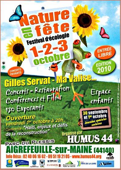 Les 1er, 2 et 3 octobre Humus 44 vous propose de découvrir ce festival d'écologie. Nombreux concerts dont dimanche celui de Gilles Servat vers 15 h 30 ainsi que les frères Landreau à 14 h.Outre de nombreux stands à visiter, vous pourrez assister à la partie festive, avec deux temps forts :
