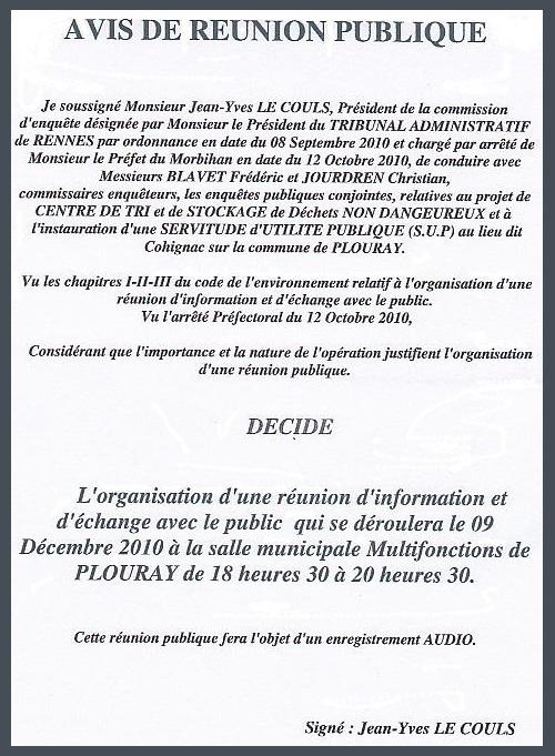 Décision de réunion publique à Plouray sur le projet GDE. 9 décembre 2010.