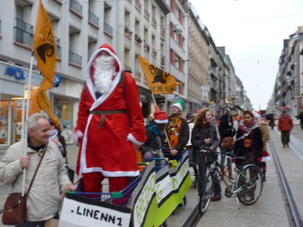 Le long de la rue Jean Jaurès des passants s'approchent et y vont de la petite image pour la boîte à souvenirs. Car il a fière allure le Tad Nedeleg sur la proue de ce navire de fortune brinquebalant sur les rails. Deux pauses s'imposent devant les temples de la consommation brestoise : Espace Jaurès et Coat Ar Gueven. La lettre au père Noël est lue en bilingue par Dewi Sibiril et une camarade. Le chemin d'une élue croise celui de nos lutins orangés. Damned, les filles et gars de Ai'ta ne doutent pas un seul instant qu'Anne-Marie Kervern se fera un plaisir de déposer la lettre sur le bureau de Monsieur Cuillandre, maire de Brest et Fañch à la ville.Menez Paul
