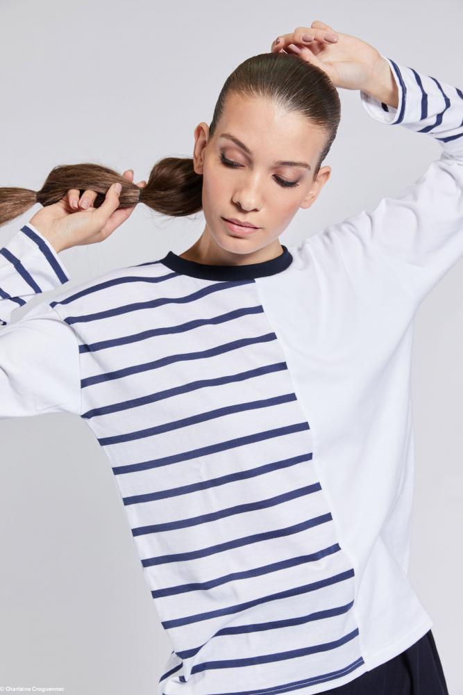 Ses premiers modèles ont très rapidement trouvé preneurs. Sa créativité déborde. Elle détourne les codes de la marinière tout en conservant l’esprit. Elle revisite les vestes de travail pour en faire des vêtements élégants. Elle surprend en s’inspirant des capuches des goémoniers du Pays Pagan pour en faire une capuche nomade, bienvenue pour les jours de pluie.