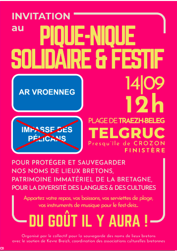 À la faveur de regroupements de communes ou de la construction de nouveaux lotissements comme à Telgruc-sur-Mer, la toponymie bretonne existante est de plus en plus ignorée par les mairies, qui souvent, subissent des pressions de la Poste alors que la loi stipule que la dénomination des voies publiques relève de la compétence exclusive des communes. La Poste invoque la nécessité de simplifier la toponymie et d'éliminer les lettres bretonnes comme le C'H qui poseraient des problèmes aux lectrices électroniques munies de décodeurs optiques. Bien que le mot n'ai pas été prononcé ce matin, tout le monde comprend que derrière ce service public, il y a une volonté de l'État d'en finir avec les évidences ancrées dans notre terre ancestrale. La toponymie bretonne est-elle devenue le dernier vestige, l'ultime preuve de l'existence d'un peuple et d'une identité différente ? Y a-t-il une volonté de faire disparaître à jamais les preuves d'un linguicide ? Beaucoup le pensent et lancent donc cet appel, non seulement aux maires pour qu'ils refusent toutes pressions venant d'ailleurs, mais aussi à toutes les Bretonnes et à tous les Bretons afin qu'ils réalisent ce qui se passe sous leurs yeux.