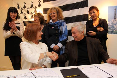 Ya d'ar Brezhoneg" par laquelle l'association s'engage à réserver une place encore plus importante à l'utilisation du breton. En dehors de la pétulante Léna Louarn, la région Bretagne était officiellement représentée par deux ambassadrices de choc Maria Vadillo vice-présidente du Conseil régional chargée du tourisme et du patrimoine, et Kaourintine Hulaud conseillère régionale, déléguée à la Maison de la Bretagne à Paris. Dans l'assistance, de nombreux élus avaient également tenu à faire le déplacement, Bruno Le Roux, Yves Cochet, Corinne Ehrel, Marylise Lebranchu, Philippe Paul, tout comme les nombreux représentants du monde économique, Groupe Le Duff, Brasseries de Bretagne Britt, distillerie Warenghem, Stered, de la culture, avec l'écrivain Irène Frain, ou des médias, Jean-Paul Ollivier ou Patrick Mahé.