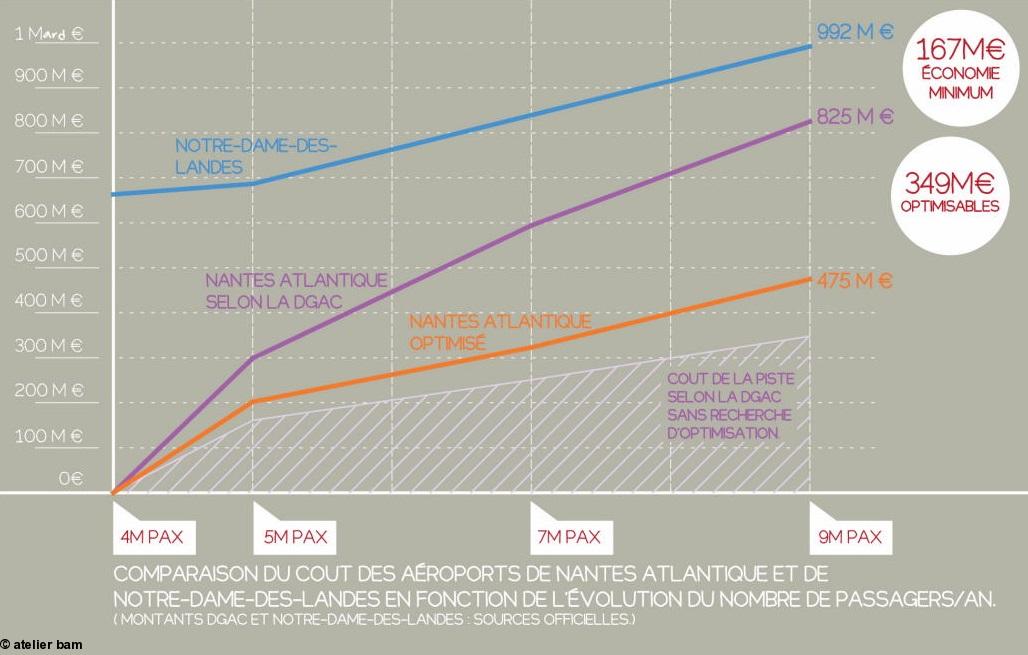 Le coût de départ (4 millions de passagers) est évalué par Vinci à 667,8 millions d'euros TTC. À l'échéance court terme (pour 5 millions de passagers), le rapport de la DGAC table sur une économie de 369 millions d'euros TTC. Une fois optimisée, cette économie atteindrait, selon notre étude, 466 millions d'euros TTC (en maintenant à l'euro près le coût de réfection de la piste annoncé par la DGAC). Étant donné que 44 % du projet sont financés par des fonds publics, cette économie possible ne nous semble pas négligeable en cette période de disette budgétaire.