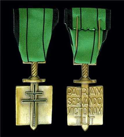 La médaille de l’ordre de la Libération est un Écu de bronze rectangulaire portant un glaive et une croix de Lorraine avec la devise Patriam servando victoriam tulit (En servant la Patrie, il a remporté la victoire) accroché à un ruban, alliant le noir du deuil au vert de l'espérance pour symboliser l'état de la France en 1940. http://www.lexpress.fr/actualites/1/culture/les-derniers-compagnons-de-la-liberation-rendent-peu-a-peu-les-armes_1057641.html
