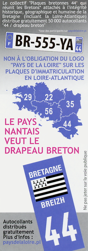Pourquoi le collectif « Plaques bretonnes 44 » Depuis que le régime de Vichy a dépecé la Bretagne en lui retirant Nantes, sa capitale historique, et a créé une région dénommée aujourd'hui Pays de la Loire, les Bretons souhaitent et crient fort leur désir de réunification. En avril 2009, les Bretons ont obtenu le droit d'utiliser officiellement leur drapeau, le Gwenn-ha-Du, sur les plaques d'immatriculation des véhicules automobiles. Néanmoins, tous les Bretons n'y ont pas accès. En effet, les habitants de Loire-Atlantique, s'ils veulent utiliser le numéro de leur département, le 44, devront mettre le logo de la région qui a annexé le département, à savoir les « Pays de la Loire ». Ainsi, on interdit sans justification l'utilisation du drapeau breton par des Bretons ! Il s'agit encore d'une des incohérences de la partition de la Bretagne. Le collectif « Plaques bretonnes 44 », qui réunit les Bretons attachés à l'intégrité historique, géographique et humaine de la Bretagne a imprimé des autocollants 44 / drapeau breton. Ces autocollants sont distribués gratuitement...