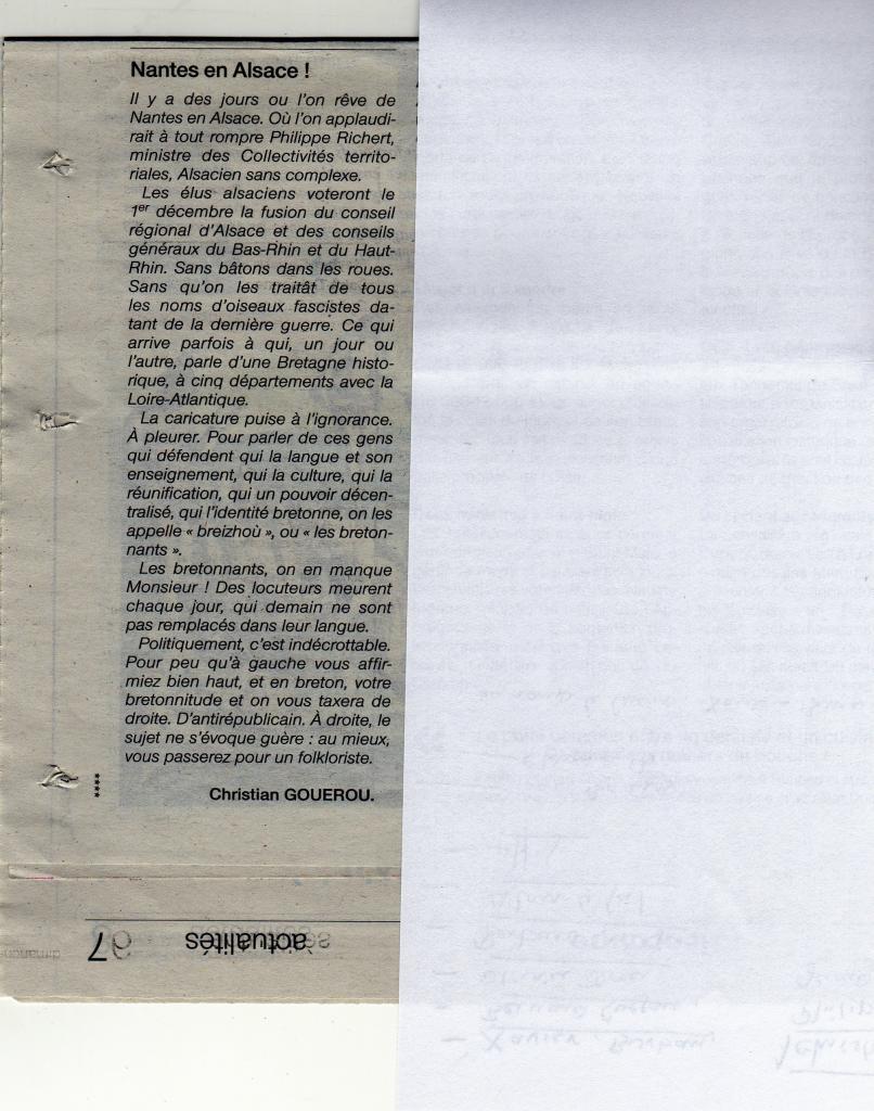 « (…) les élus alsaciens voteront le 1er décembre la fusion du conseil régional d'Alsace et des conseils généraux du Bas-Rhin et du Haut-Rhin. Sans bâtons dans les roues. Sans qu'on les traite de tous les noms d'oiseaux fascistes datant de la dernière guerre. Ce qui arrive, parfois, à qui, un jour ou l'autre, parle d'une Bretagne historique à cinq départements avec la Loire-Atlantique. (…)
