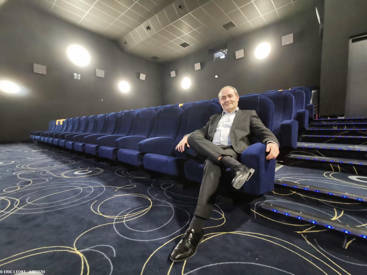 Nous avons rencontré Yves Sutter, PDG de CINEVILLE, ce mardi 17 décembre 2019, entre les aspirateurs et les derniers câbles posés sur les écrans à l’accueil, dans une salle sentant bon le neuf, assis au premier rang, nous avons évoqué ce nouveau pari pour le groupe, filiale de la Sorédic. Ce complexe ouvre enfin après un feuilleton long de plus de dix ans, avec des rebondissements dignes de la saga Star Wars et l’on peut dire sans se tromper que cette issue positive est due à la ténacité du Jedi bigouden Bernard le Floch, l’adjoint à la culture de Pont-l’Abbé.