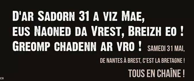De Nantes à Brest c'est la Bretagne. Tous en chaîne ! Eus Naoned da Vrest, Breizh eo ! Cours Saint Pierre à Nantes et place de la Liberté à Brest le samedi 31 mai