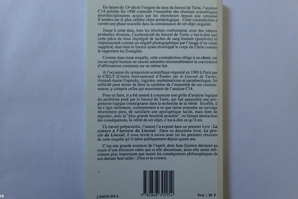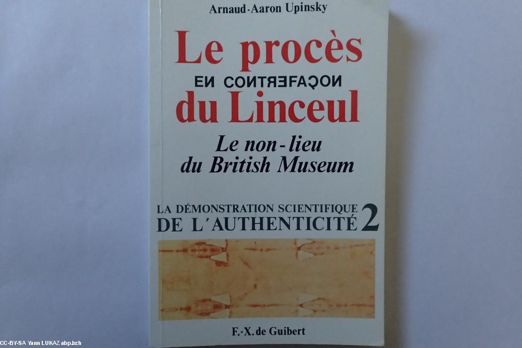 - levr / livre "Le procès en contrefaçon du Linceul. Le non-lieu du Bristish Museum" par Arnaud-Aaron Upinsky. Edition F-X de Guibert 1993. 83 pages. Petit livre, par un scientifique, expliquant comment et pourquoi le British Museum a été amené à se rétracter, et donc à invalider non pas les mesures (protocoles contestés) mais les conclusions hâtivement et imprudemment annoncées par les équipes responsables de l’analyse C14 de 1988. Conclusion: d'un point de vue scientifique, le Linceul de Turin reste énigmatique et inexpliquable. Non pas pour le tissu et les éléments annexes (sang humain, etc..), bien étudiés, mais pour le mode de production de l’image 3D inversée en surface (roussissure des fibres sur quelques microns). Quand la Science bute sur une réalité qui la dépasse.