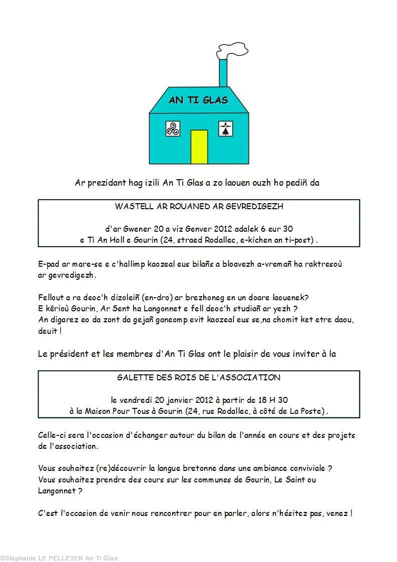 Ar prezidant hag izili An Ti Glas a zo laouen ouzh ho pediñ da WASTELL AR ROUANED AR GEVREDIGEZH d'ar Gwener 20 a viz Genver 2012 adalek 6 eur 30 e Ti