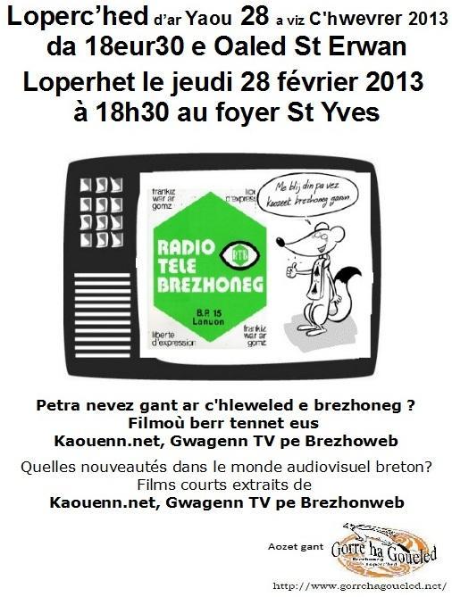 Quelle est la place du breton à la télé ? Après la manifestation de samedi, sommes nous efficace ? De la minute de Charlez Ar Gall à l'échec de TV Breizh, la gwerz de Bernez Tangi montre bien la place pitoyable du breton à la télé: Galicien, catalan ou basque 168 heures / semaine Gaélique, gallois 35-36 heures / semaine Corse : 28 heures / semaine Breton : 1 heure 1/2 / semaine Qu'en pensent les manifestants bretons ? Propos étayés par des films courts de l' INA, Gwagenn TV, Kaouenn FM ou Brezhoweb… suivi d'un débat…