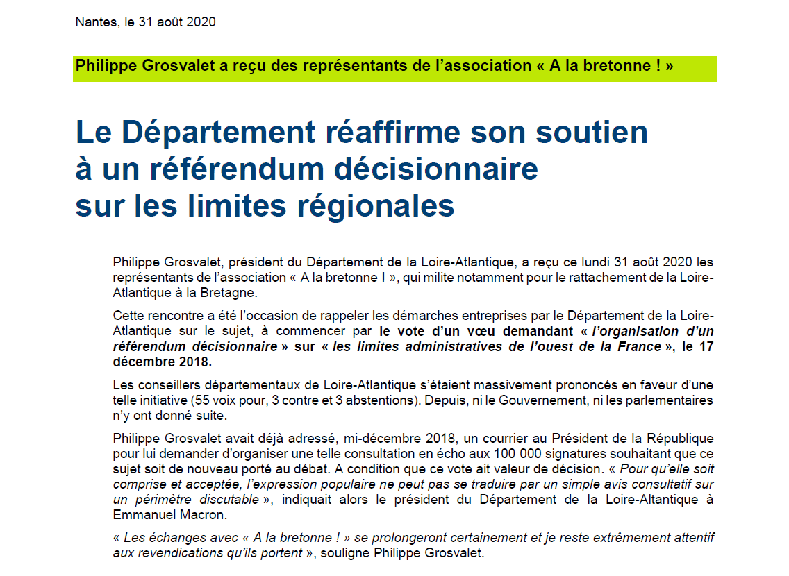 Le président du Conseil départemental de Loire-Atlantique a reçu notre partenaire A LA BRETONNE! avec lequel il souhaite poursuivre des échanges constructifs. Il réitère sa demande d'engager un référendum décisionnaire sur les limites régionales. Il a enfin bien noté l'événement politique prévu le 11 octobre à Nantes, coorganisé par A LA BRETONNE! et BREIZH CIVIC LAB.