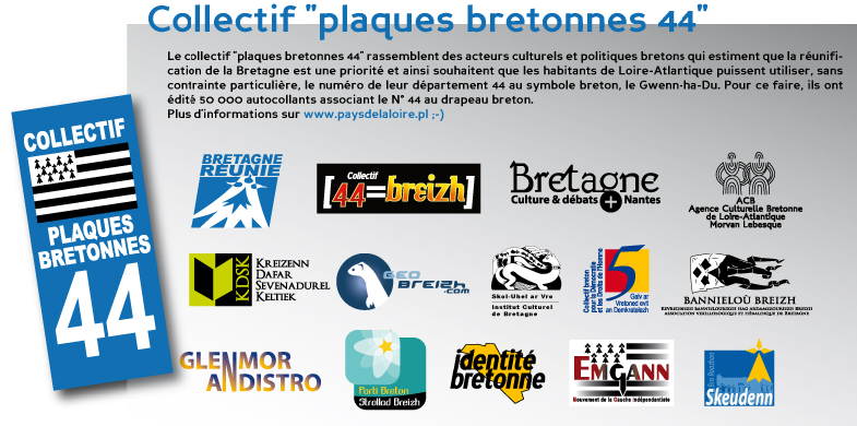 Pour ce faire, le collectif "plaques bretonnes 44", qui réunit des acteurs associatifs et politiques bretons, lance une grande opération pour diffuser gratuitement aux habitants des cinq départements bretons l'autocollant 44, associé au drapeau breton (1), en parallèle d'une pétition qui sera déposée au Parlement européen que vous pouvez signer à l'adresse suivante : http://www.paysdelaloire.pl (avec .pl à la fin comme plaques…).