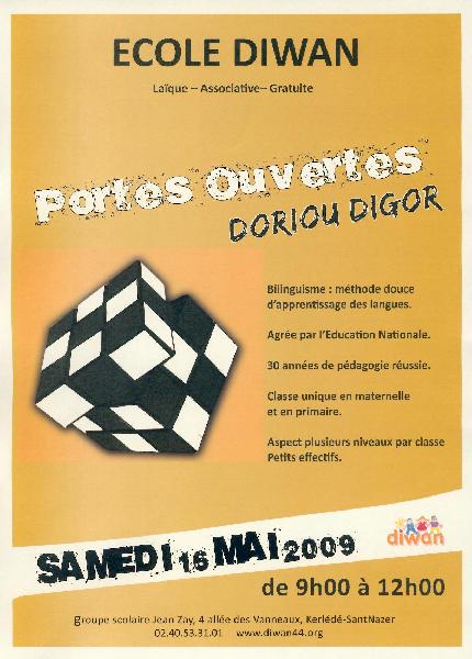 L'école Diwan de Saint-Nazaire nous fait part de sa journée « Portes Ouvertes » le samedi 16 mai 2009 de 9h00 à 12h00 au groupe scolaire Jean Zay, 4 allée des Vanneaux, Kerlédé-Sant-Nazer.