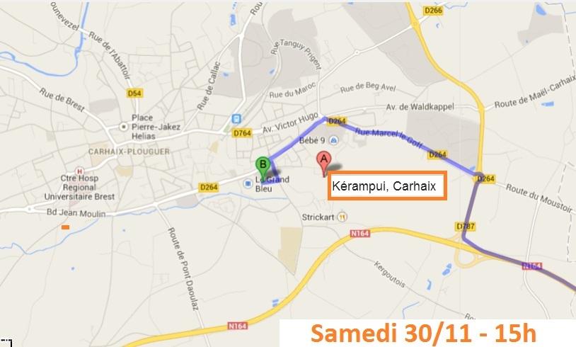 — Départ de Nantes à 8 h 45 du parking Leclerc Océane de Rezé et à 9 h 15 du parking Leclerc Atlantis de Saint-Herblain. Le point de rendez-vous exact n’est pas précisé mais un car se voit de loin dans ces immensités... — Arrivée prévue à Carhaix vers 14 h ; Lieu du rassemblement : Kerampuilh en contre-bas de l’Espace Glenmor et du cinéma Le Grand Bleu, au sud de la rocade ou bd Jean Moulin (site des Vieilles Charrues) ; — Départ de Carhaix vers 18 h / 19 h ; — Arrivée prévue à Nantes vers 22 h / 23 h.