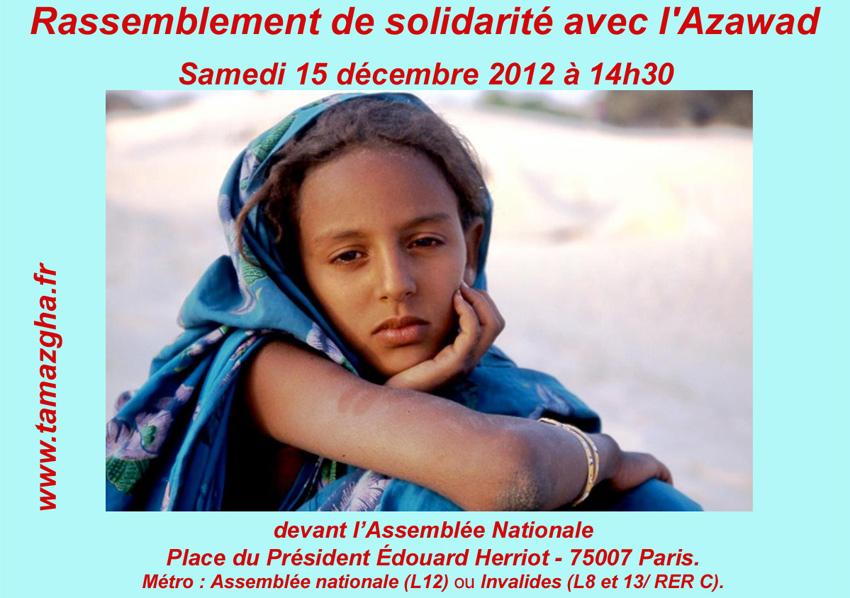 Dans le cadre de son action de solidarité avec l'Azawad et la lutte des Touaregs pour l'accès à leur indépendance, Tamazgha appelle à un rassemblement en faveur de l'indépendance de l'Azawad le samedi 15 décembre 2012 à 14h30 devant l'Assemblée nationale (Place du Président Édouard Herriot, 75007 Paris).