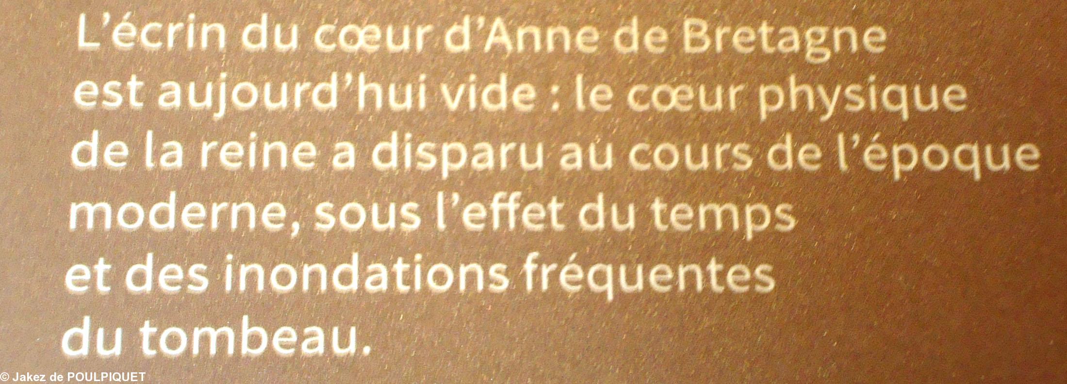 - Dans le premier panneau (photo ci-jointe) l'explication vague et fantaisiste : « L'écrin du c½ur d'Anne de Bretagne est aujourd'hui vide : le c½ur physique de la reine a disparu au cours de l'époque moderne, sous l'effet du temps et des inondations fréquentes du tombeau »