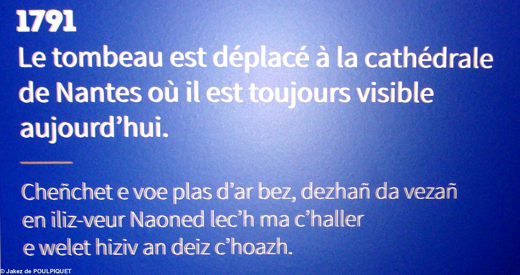 Dans le deuxième panneau traduit en breton (photo ci-jointe) on lit : « 1791 : le tombeau est déplacé à la cathédrale de Nantes où il est toujours visible aujourd 'hui »