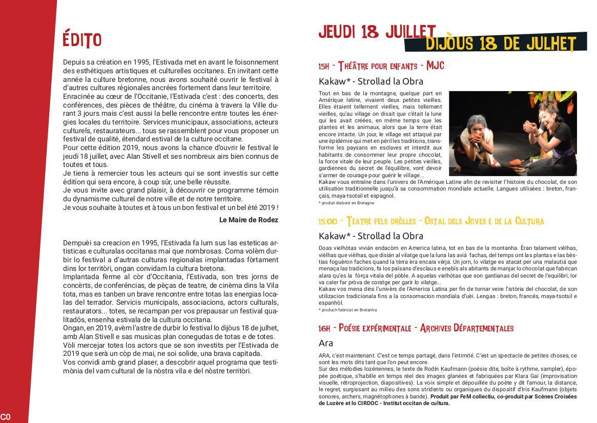 Les 18 et 19 juillet 2019 se tiendra la Première Rencontre des Théâtres en Langues de France lors du Festival Estivada organisé par la ville de Rodez qui nous fera l'honneur de nous accueillir.
