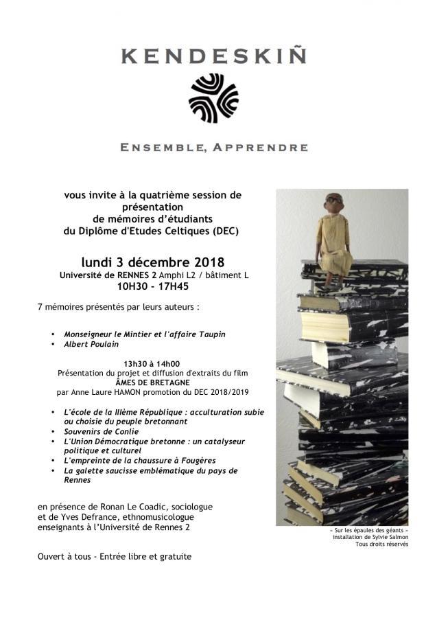 Kendeskiñ, association des actuels et anciens élèves du Diplôme d’Etudes Celtiques à le plaisir de vous inviter à la 4ème Journée de présentations de dossiers du Diplôme d'Etudes Celtiques (DEC) par leurs auteurs, lundi 3 décembre 2018 à l’Université de Rennes 2 Amphi L2/ bâtiment L de 10H30 à 17H45.