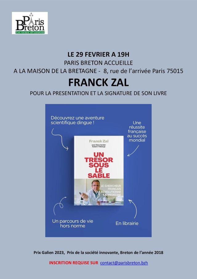 Franck Zal présentera et dédicacera son livre sur son parcours de chercheur en Bretagne Le Dr. Franck Zal a construit sa reconnaissance scientifique sur son expertise dans le domaine des pigments respiratoires appartenant à des invertébrés marins. Après 15 années de recherche fondamentale au sein du CNRS, Franck Zal crée la société Hemarina en 2007. Il est l’auteur de plusieurs dizaines de brevets internationaux, de plus de 130 publications et plus d’une centaine de présentations lors de congrès scientifiques. Il est aujourd’hui Président de Biotech Santé Bretagne, membre du conseil de surveillance d’Inserm Transfert et VP Médecine Régénérative au sein du conseil d’administration d’Atlanpole Biothérapies. Franck est titulaire d’un doctorat en Océanographie (université Pierre-et-Marie-Curie, Sorbonne Université) complété de trois années de post-doctorat effectuées à l’université de Santa Barbara en Californie (UCSB) puis à l’université d’Antwerp en Belgique. Il est également titulaire d’une Habilitation à Diriger des Recherches (Sorbonne Université) et d’un Executive MBA (Rennes School of Business). Il a obtenu de nombreuses distinctions, dont dernièrement le prestigieux prix Galien pour son dispositif médical HEMO2life®.