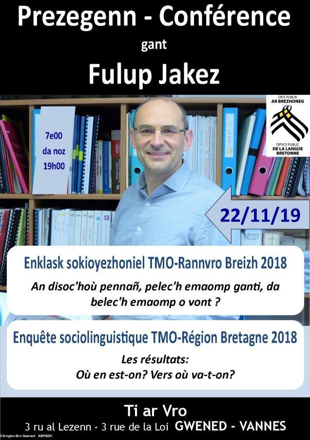 Conférence animée par Fulup Jakez, directeur de l’Office Public de la langue bretonne : "Enquête sociolinguistique TMO-Région Bretagne 2018. Les résultats: Où en est-on ? Vers où va-t-on ?"
