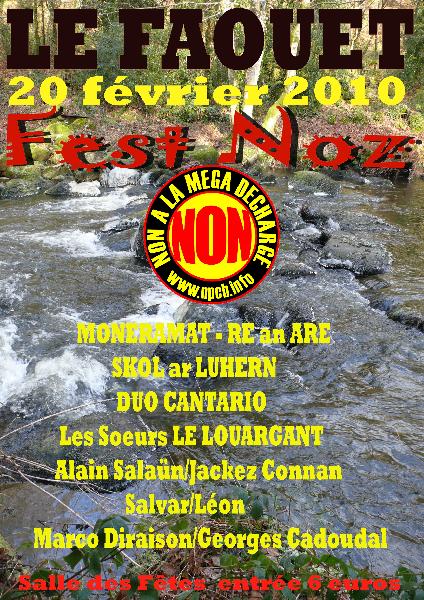 Le prochain fest noz de soutien de NPCB aura lieu le 20 février prochain à la Salle des Fêtes du Faouët (56320). Il n'est pas exclu que nous soyons contraints d'utiliser des moyens juridiques pour empêcher ce projet de mégadécharge, nous devons donc nous y préparer financièrement.