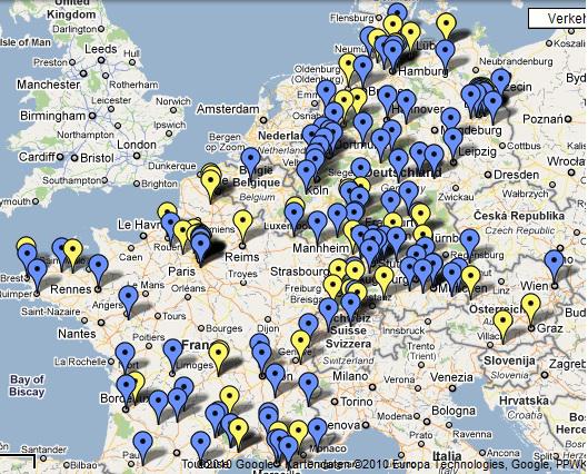 La carte donne une vue d'ensemble sur les premières le 23 septembre 2010 (icônes bleues) ainsi que les autres projections qui auront lieu ultérieurement (icônes jaunes).