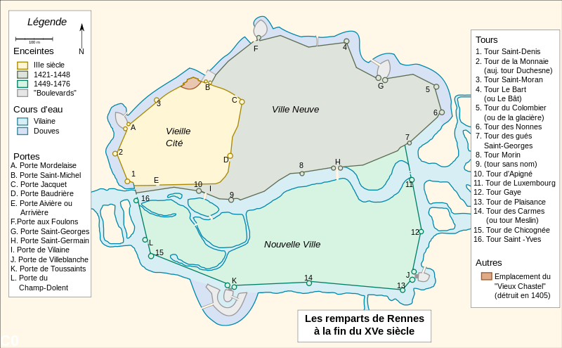 Mais laissons là tous ces gens et partons explorer la ville. A l'est du Champ-Jacquet se voit le Beffroi (1467) construit sur la tour Saint James, avec ses gargouilles à têtes de dragon, son horloge, le bourdon « madame Françoise » et son jaquemart, un saint Michel doré qui tourne la tête et brandit son épée (Rabelais en parle). Descendant vers la Vilaine par la rue Tristin ou la rue Neuve, voici la Grande Porte (porta magna) entre la place du Calvaire et la Baudrairie. Dans cette rue Tristin ou Trégetin, débuta l'incendie de 1720. Rue saint Yves se trouvait l'hôtel ducal ou François II et Anne de Bretagne furent reçus. Les dames de compagnie logeaient rue Saint-Denis (rue des Dames). En 1490, s'y déroula la cérémonie secrète du mariage par procuration de la « bonne duchesse » : avec Maximilien d'Autriche. Plus tard, le conseil de ville se réunit dans ce logis. La chapelle et l'hôpital Saint-Yves furent construits par un prêtre de Tréguier. Les Juifs de Rennes vivaient le long de la Vilaine, à coté de l'hôpital Saint-Yves. Ils possédaient une synagogue entre la porte Mordelaise et la tour Moran. Le duc de Chaulnes, gouverneur de Bretagne, qui réprima les révoltes du Papier timbré et des Bonnets Rouges, y gagnant au passage le sobriquet de "gros cochon", demeurait à l'hôtel de Brilhac, rue des Dames, dont les jardins donnaient sur la promenade du Mail, qu'il fit construire et planté d'ormes, le long de la Vilaine, aux environs du pré Raoul.