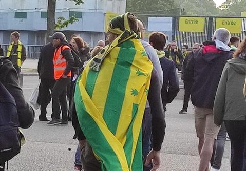 L'enthousiasme des supporters a soutenu le courage militant. Oui, nos drapeaux s'arrachaient comme des petits pains ! Incroyable cette popularité, cet engouement pour le GWENN HA DU. C'est fort de sens, c'est un message clair aux élus quels qu'ils soient, la Bretagne intégrale, la Bretagne Breizh Brittany, les Nantais la veulent. Alors, assez de blocages, assez de mépris, assez de violence politique créée par cette partition. A noter l'absence de supporters hostiles. Bien au contraire, un grand enthousiasme en apprenant que c'était le Conseil régional de Rennes qui offrait les drapeaux bretons.