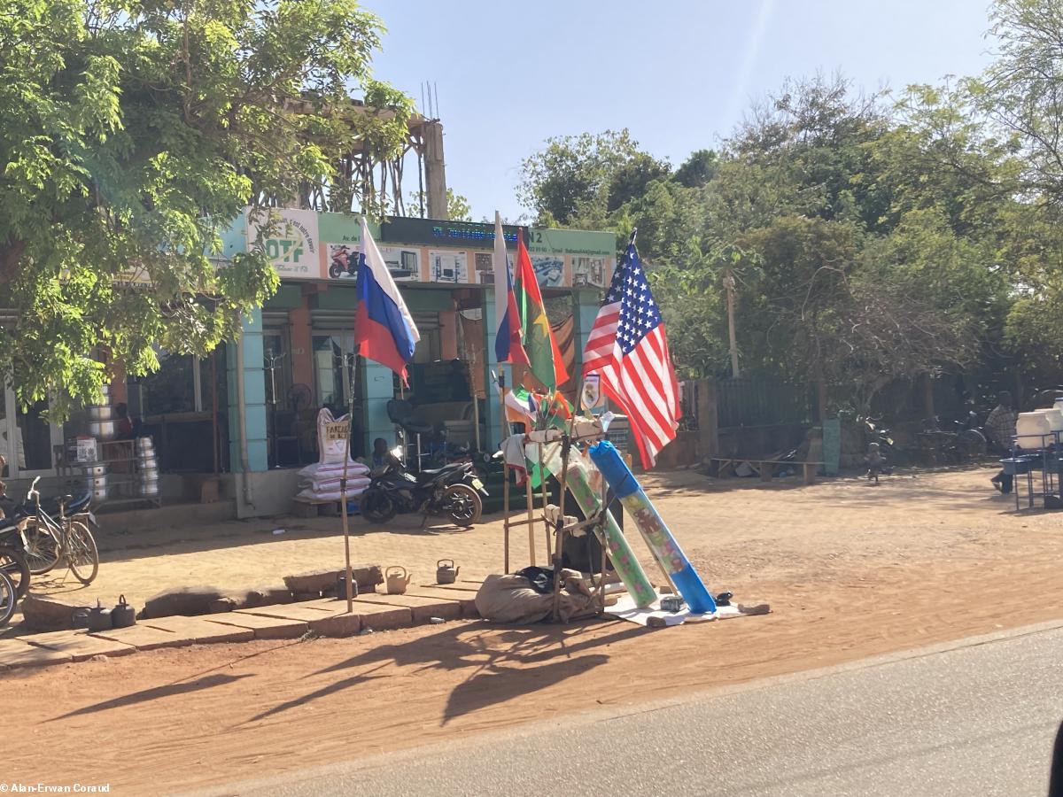 Le désir de liberté pour un peuple n’est pas passé de mode En illustration de cette tribune, une photo que j’ai prise dans une rue de Ouagadougou, capitale du Burkina Faso. Les vendeurs de drapeaux proposent côte à côte les drapeaux russe et américain. Les USA participent à la modernisation des infrastructures au Burkina. La nouvel axe routier Ouagadougou- Bobodioulasso a été financé par les Etats-Unis. Mais c’est aussi dans le comportement des ambassadeurs américains que l’on explique cette mansuétude pour ce pays. Lorsque des militaires burkinabés sont tués par les djihadistes l’ambassade américaine met son drapeau en berne. Les ambassadeurs français qui se sont succédé sont tous les mêmes, issus du même moule. Pas la moindre empathie pour les morts, bien au contraire ils donnent des leçons. Ils sont arrogants, suffisants et méprisants. Quant à l’armée française, présente pour défendre les intérêts économiques tricolores, elle est le jouet d’un État français qui continue sa politique néo-colonialiste ceci depuis les fausses indépendances de 1960. Si plus de 80 leaders africains ont été assassinés nous retiendrons les 23 présidents ou futurs présidents que la Françafrique a éliminés souvent par l’intermédiaire de ses larbins locaux, empêchant par là-même ces pays de toute possibilité d’émancipation et de prise en main de leur économie en toute souveraineté.