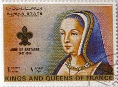 - Planche des 34 rois et reines de France émise en 1972 par l\'émirat d\'Ajman. Anne de Bretagne est en 3e ligne et 3e colonne.