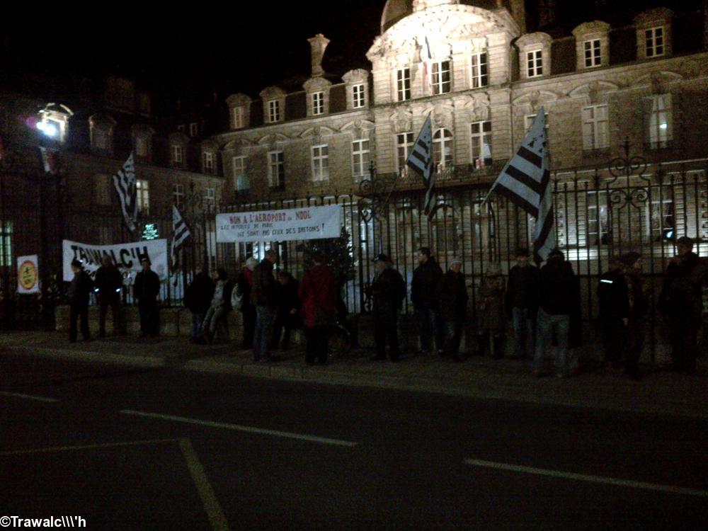 Une cinquantaine de personnes a participé au rassemblement contre l'aéroport à Notre-Dame des Landes devant la préfecture de Vannes ce soir, 30/11/12, sous le slogan “Les intérêts de Paris ne sont pas ceux des Bretons”. Une motion a été déposée en préfecture. Veuillez trouver ci-dessous la prise de parole du Collectif Trawalc'h.