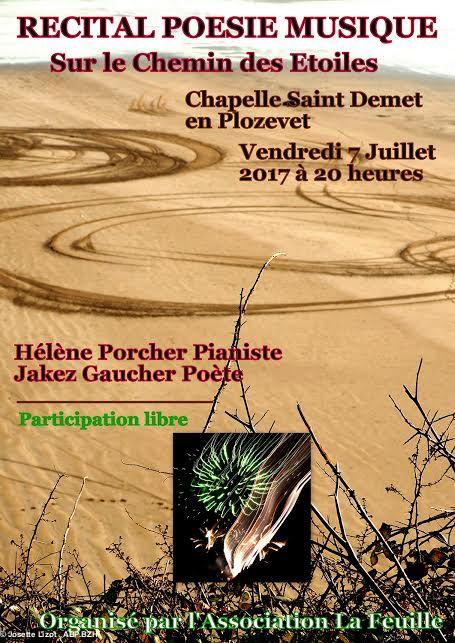Le vendredi 7 juillet,à 20 heures, à la chapelle Saint-Demet en Plozeved, aura lieu un récital de poésies par Jakez Gaucher. Il sera accompagné par la pianiste Hélène Porcher.