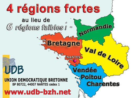 Des Régions fortes ? L' UDB propose depuis longtemps de transformer les 6 régions administratives faibles et illisibles qui découpent l'ouest de la France depuis un demi-siècle en 4 régions fortes, à l'identité affirmée et équilibrées du point de vue démographique, à savoir une Normandie et une Bretagne réunifiées, une région Vendée-Poitou-Charentes conforme à l'héritage culturel de ces territoires (la Vendée correspond au Bas-Poitou) et une nouvelle région Val de Loire construite autour d'un axe Anjou-Touraine et d'ores et déjà reconnue au patrimoine mondial de l'Unesco. Cette réorganisation répond à l'exigence de réunification de la Bretagne exprimée par une majorité de Bretons et d'élus des 5 départements (10.000 manifestants à Nantes le 20 septembre dernier dont les présidents du Conseil régional de Bretagne et du Conseil général de Loire-Atlantique). Elle correspond également à l'intérêt des autres citoyens de l'ouest de la France.