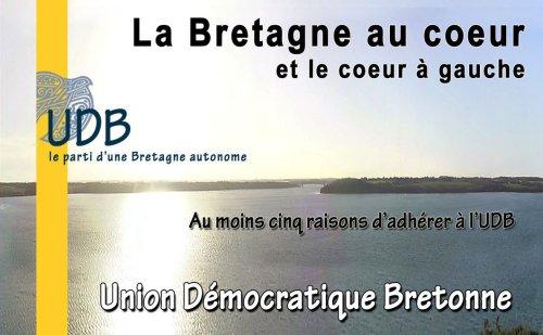 Fidèle à ses principes, « la Bretagne au cœur, et le cœur à gauche », l'Union démocratique bretonne défend une Bretagne forte et riche de son identité dans une République rénovée et une Europe sociale.