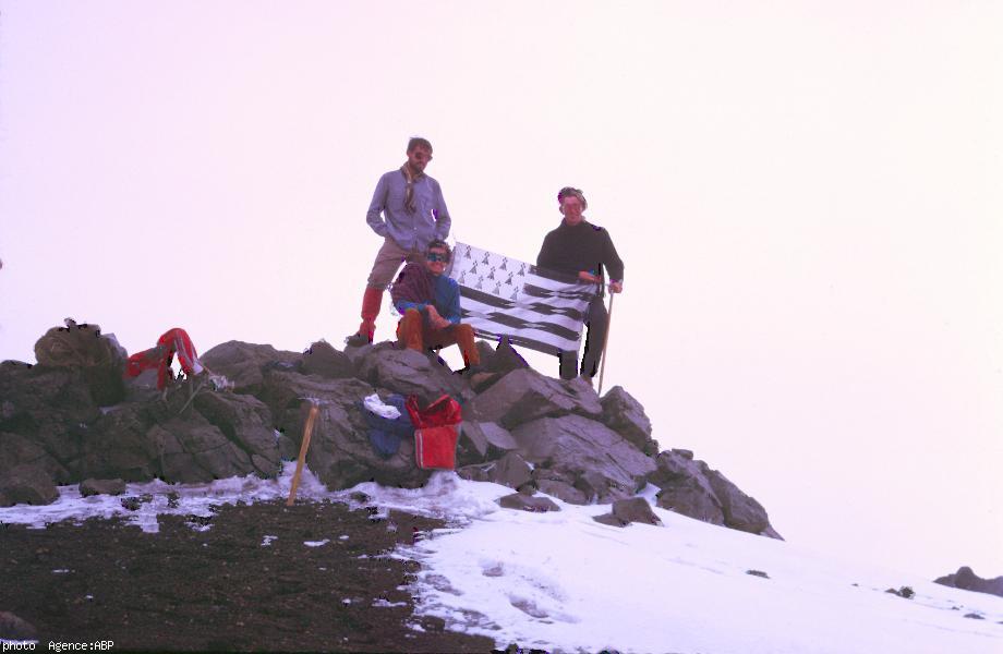 Bernard Le Nail : Oui, j'avais emporté avec moi un drapeau breton, qui m'a d'ailleurs servi aussi plus tard pour faire du stop lors de mon grand tour d'Amérique Latine, par exemple au Chili... Nous étions plusieurs Bretons dans ces courses en haute montagne, dont Françoise Moal qui a poursuivi une carrière d'enseignante à l'étranger - je crois qu'elle a longtemps été au lycée français de Londres - et Jean-Noël Salomon, dont les ancêtres étaient de la région de Gouarec et qui a fait une belle carrière universitaire - c'est un des grands spécialistes des karsts en géographie physique - et il a longtemps enseigné à l'Université de Bordeaux, où il a aussi dirigé pendant un temps les presses de l'Université. Nous avons fait flotter le Gwenn-ha-du sur les plus hauts sommets du Mexique et, à l'époque, Ouest-France a reproduit une photo de notre cordée avec le drapeau breton...