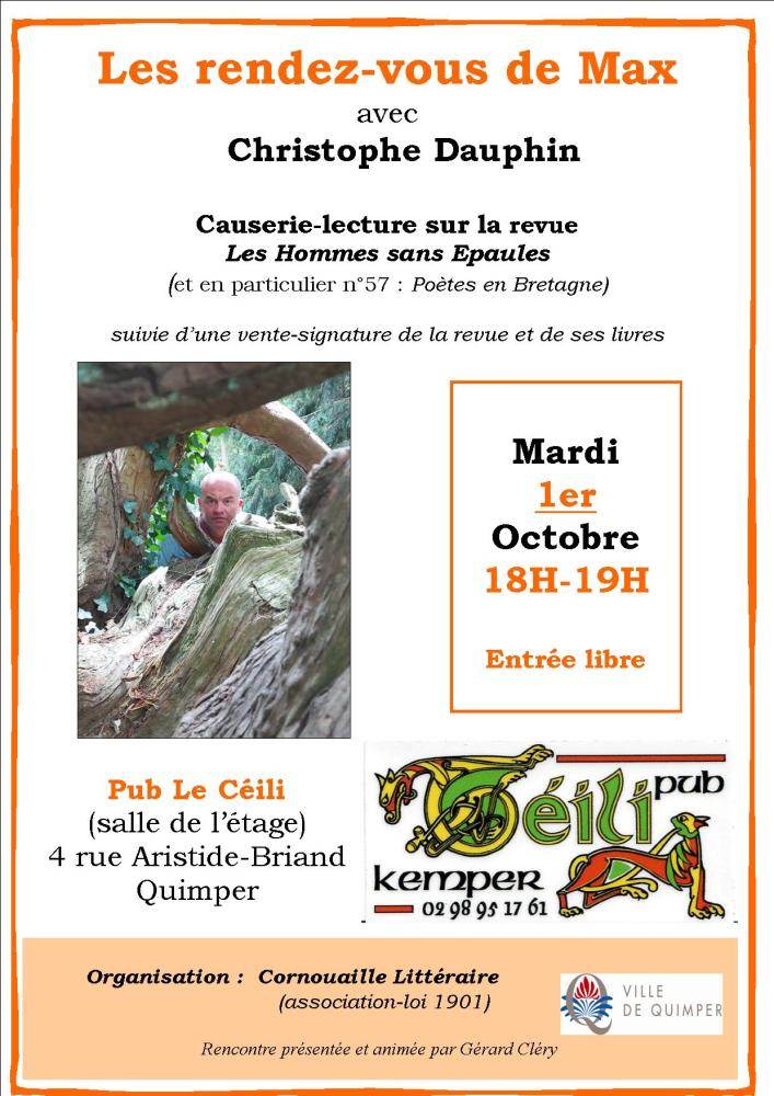 "Les rendez-vous de Max", rencontres organisées par Cornouaille Littéraire, accueilleront, mardi 1er octobre à 18 h au Pub Le Céili de Quimper, la causerie-lecture du poète et essayiste Christophe Dauphin, qui dirige la revue semestrielle "Les Hommes sans Epaules" dont il présentera le numéro consacré aux poètes bretons paru cette année.